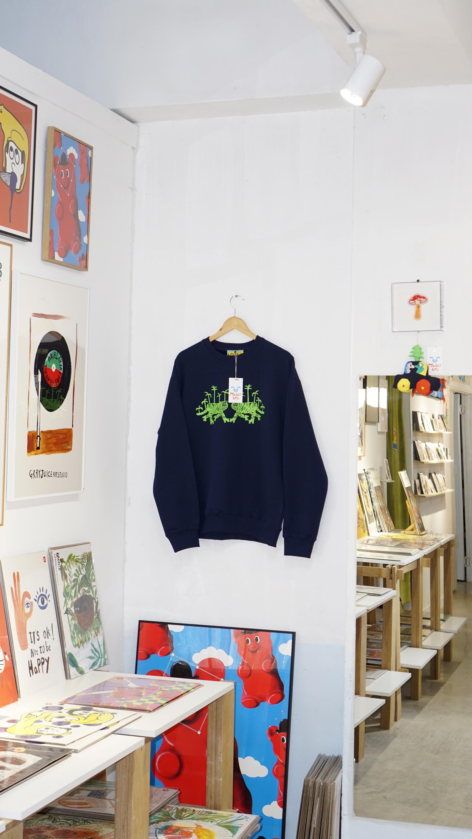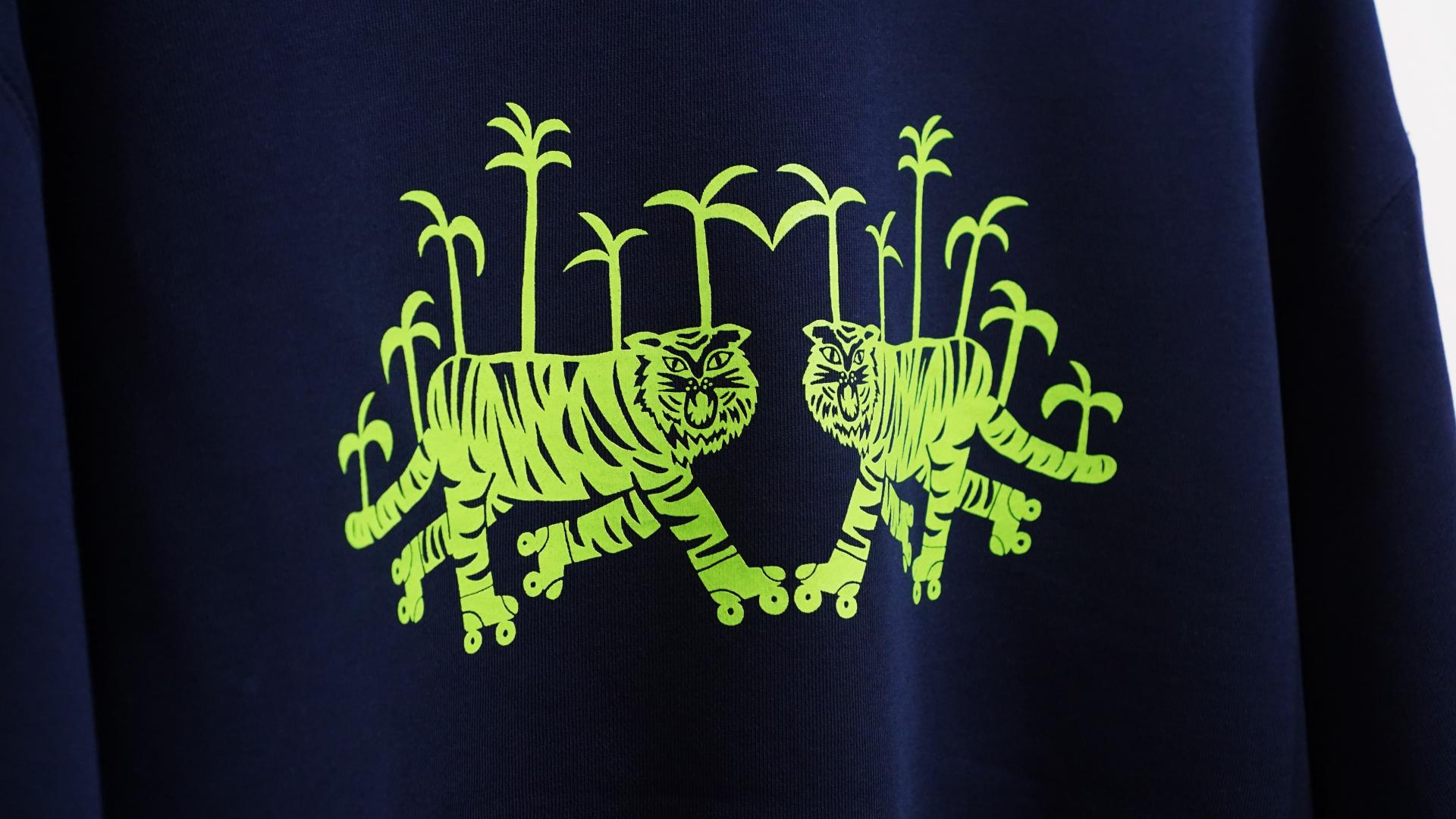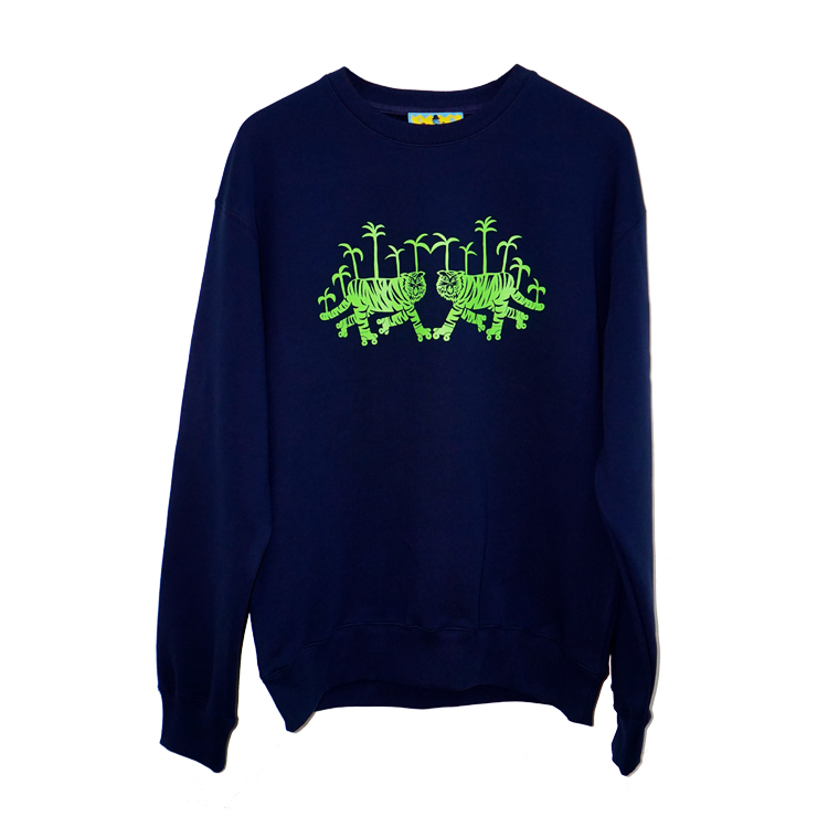 네이비 원단 위에 형광 그린 타이거 그래픽이 돋보이는 맨투맨입니다