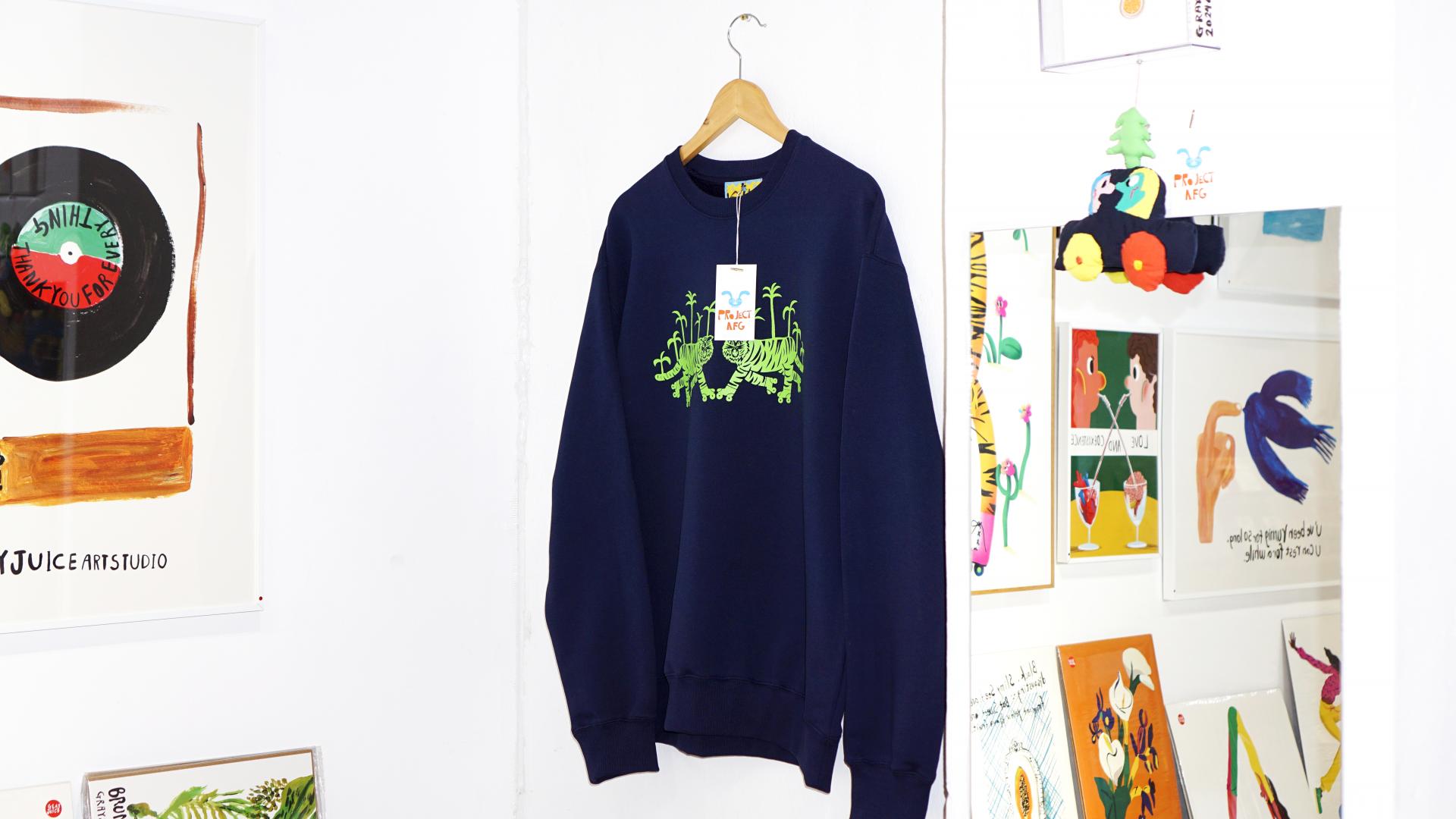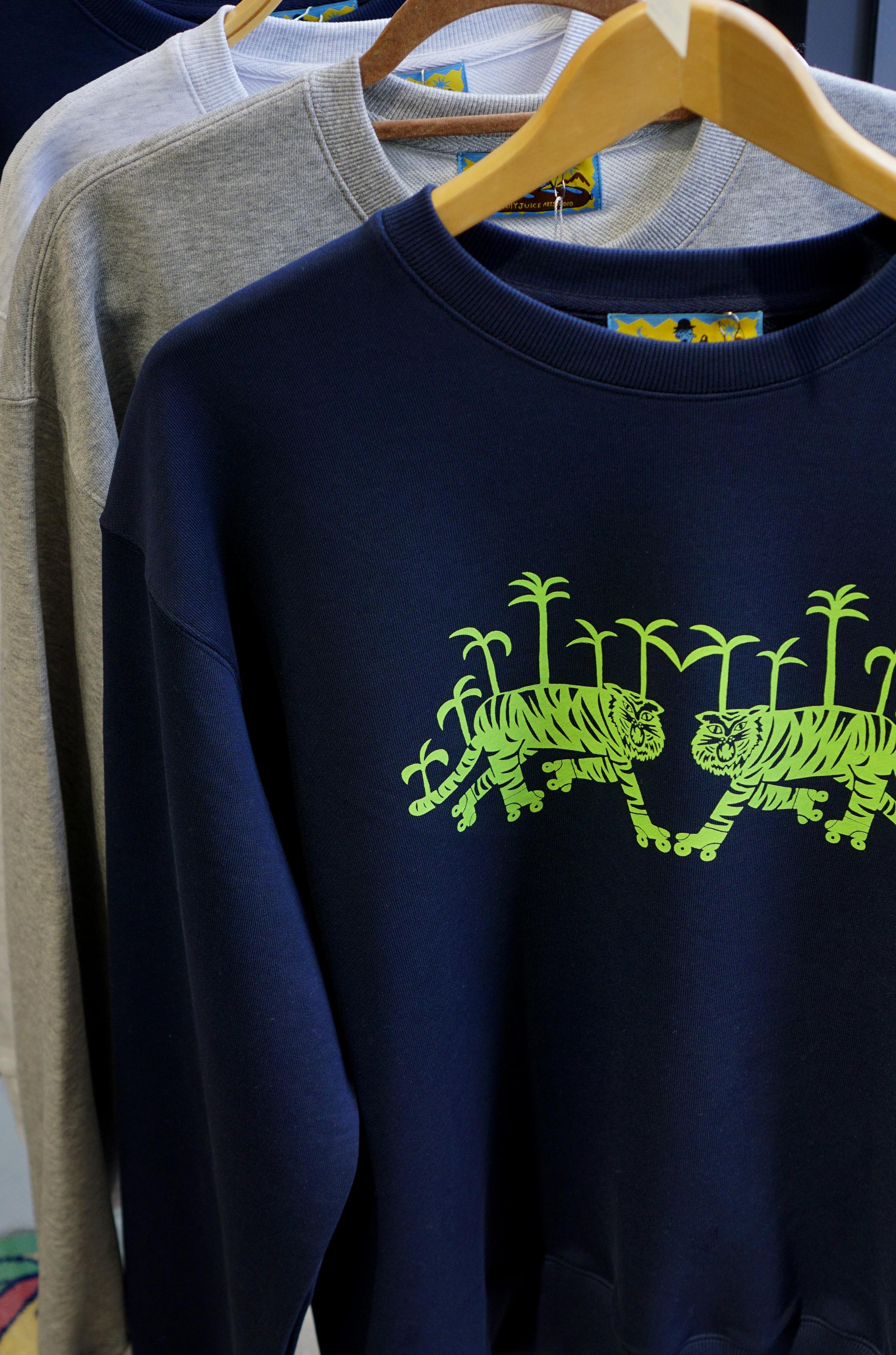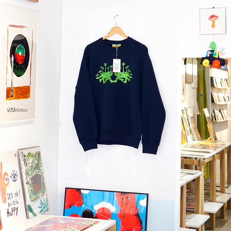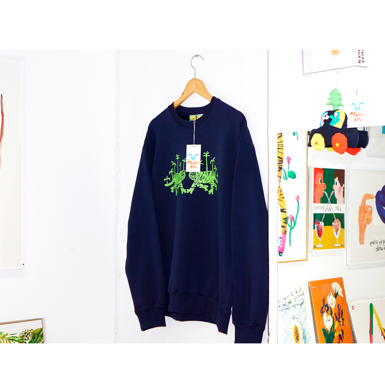 네이비 원단 위에 형광 그린 타이거 그래픽이 돋보이는 맨투맨입니다