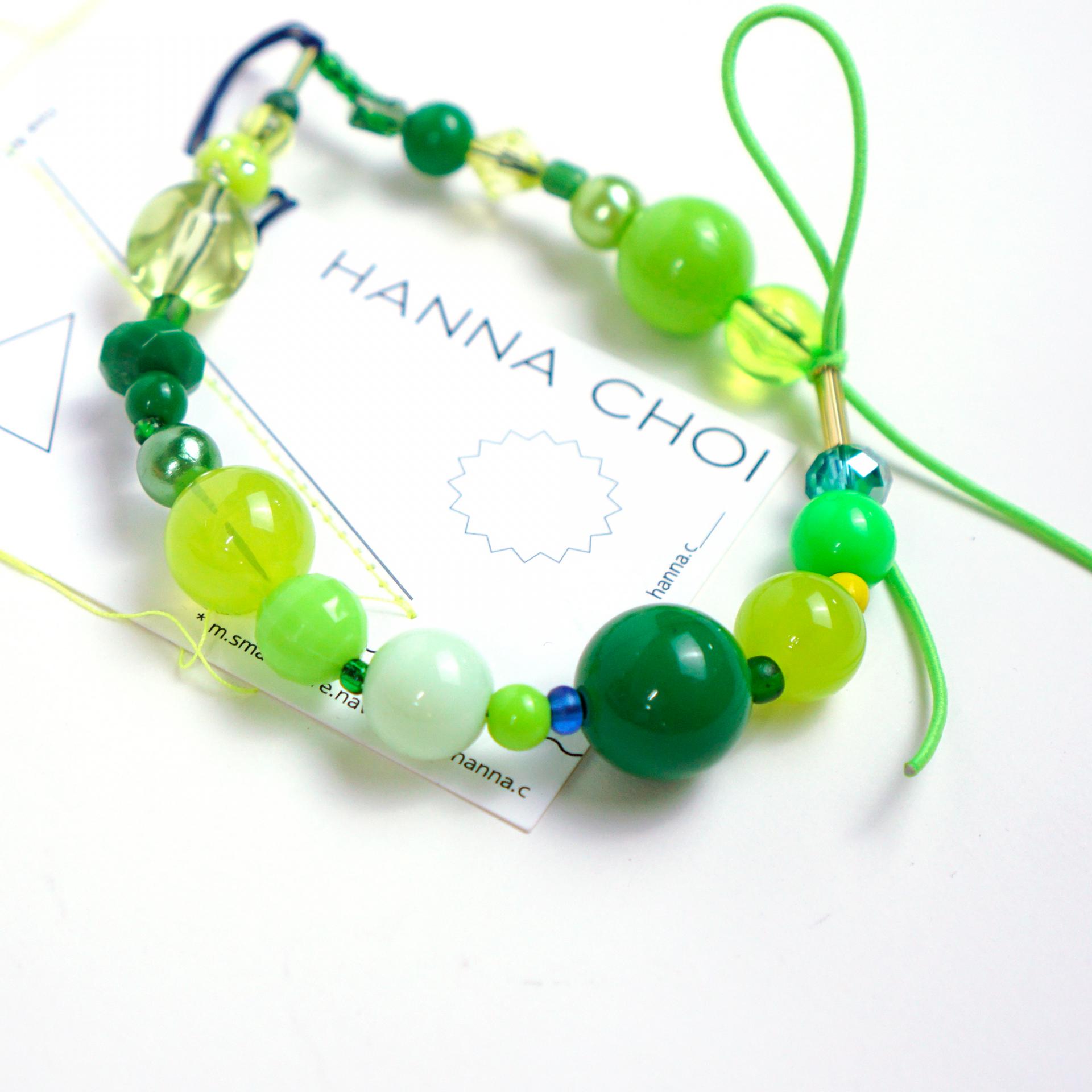 다양한 그린 컬러의 비즈들이 리듬감 있게 이어져